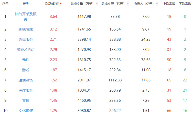 9月10日,中国在北京的经济网络,如今A-CARP的三个主要指数共同增加了。最后,上海化合物指数为3,812.22点,增长了0.13%,销售额为82,111亿元。深圳市成分指数为12,557.68点,增长了0.38%,销售额为1,15.70亿元人民币。 Chinext指数为2904.27点,增长了1.27%,销售额为5631.1亿元人民币。工业部门,提取和石油和天然气服务,电影和电视剧院,通信服务和其他部门位于利润的顶部,而非金属材料,能源金属,电池和其他部门则位于下降的一部分。 A-CARPART市场部门的上升和秋季分类